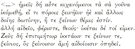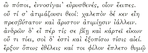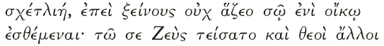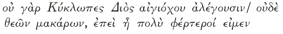 Различия в системе ценностей Одиссей просит Полифема о подарках, считая, что Полифем должен уважать богов (____1_! &____'_! ____). Однако очевидно, что уважение к богам, а тем более чувство благоговения перед ними, Полифему незнакомы. Поэтому упоминание о Зевсе – покровителе гостеприимства (E_% ._(___) не трогает его. Полифем оценивает других по их силе и слабости ***************** , а циклопы, по его мнению, намного сильнее богов (__ % &__'___( _____). Здесь мы сталкиваемся с разной системой оценок. Одиссей апеллирует к моральным принципам, которые совершенно не знакомы циклопам. Полифем намекает Одиссею, что тот совершенно не понимает, куда он попал, и не имеет никакого представления о циклопах ( ______ __! 0 ._1_9! H '/ ____ __ 9 ____). Интересно сравнить эту фразу с фразой, которую произносит Менелай в ответ на вопрос своего советника о том, нужно ли принять гостей или же отослать их [38]: