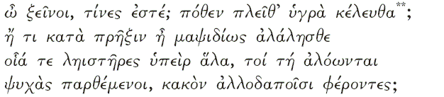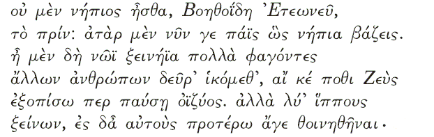 Однако появившийся вскоре Полифем не очень дружелюбен к своим гостям. Увидев, что в его пещеру забрались люди, он спрашивает их: Оскорбительный вопрос Спрашивая о том, с какой целью путешествуют Одиссей и его спутники – по какому-то делу (__'_ __5.__), то есть как торговцы, или без дела (__6__(), то есть как пираты (_7 '_ /__'5__), – Полифем задает как будто бы довольно оскорбительный вопрос. Ведь есть и другие обстоятельства, позволяющие говорить о возможном скрытом подтексте вопроса в этой ситуации. Во-первых, Одиссей и его спутники часто вели себя как пираты (достаточно вспомнить хотя бы разграбление города киконов). Кроме того, в данном случае Одиссей и его соратники, забравшиеся в чужой дом и взявшие чужое имущество, похожи именно на пиратов. Однако, с нашей точки зрения, это вполне нейтральный вопрос, который не оскорбителен для гостей. Необходимо учитывать, что пиратство, по свидетельству некоторых греческих историков (и, в частности, Фукидида [32] **************), не считалось в древние времена недостойным занятием, а вопрос к чужестранцу, не пират ли он, был вполне типичен и не имел негативного оттенка ***************. Вопрос Полифема несколько прямолинеен и не совсем своевременен: он задает его, едва увидев Одиссея и его спутников. Согласно законам гостеприимства, хозяин должен был бы сначала принять гостей и накормить их, а затем уже расспрашивать. Несколько дидактичный Ван Лойвен в своем издании «Одиссеи» комментирует это так: « Monstrum inhumanum et inhospitabile advenas statim adspectos interrogavit ; cultorum vero hominum erat peregrinos prius hospitio excipere , dein rogare qui essent , unde quo consilio venissent » [34]. Одиссей последовательно отвечает на три вопроса Полифема (о том, кто он и его спутники, откуда они прибыли и с какой целью) **************** , скрывая собственное имя, но рассказывая при этом о своих славных подвигах под Троей. Затем он добавляет:
