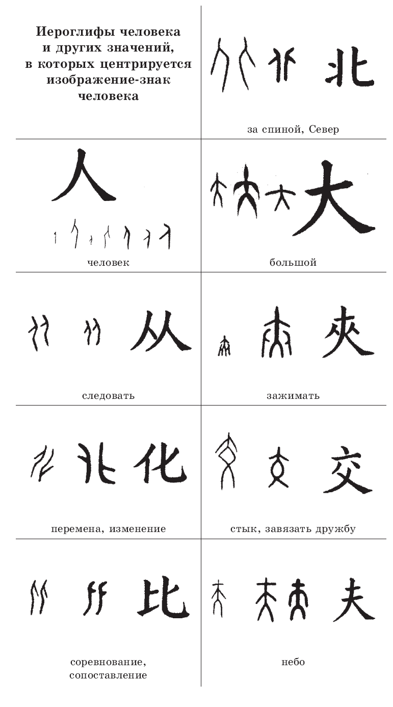 Конфуций писал: «Большой человек (благородный муж) помогает людям претворять хорошее, что заложено в них, и не помогает претворять плохое, что заложено в них. Маленький человек поступает наоборот». Можно сказать, что Конфуций вникал в основные зна- чения некоторых иероглифов, особенно тех, которые связаны со значением «человек».